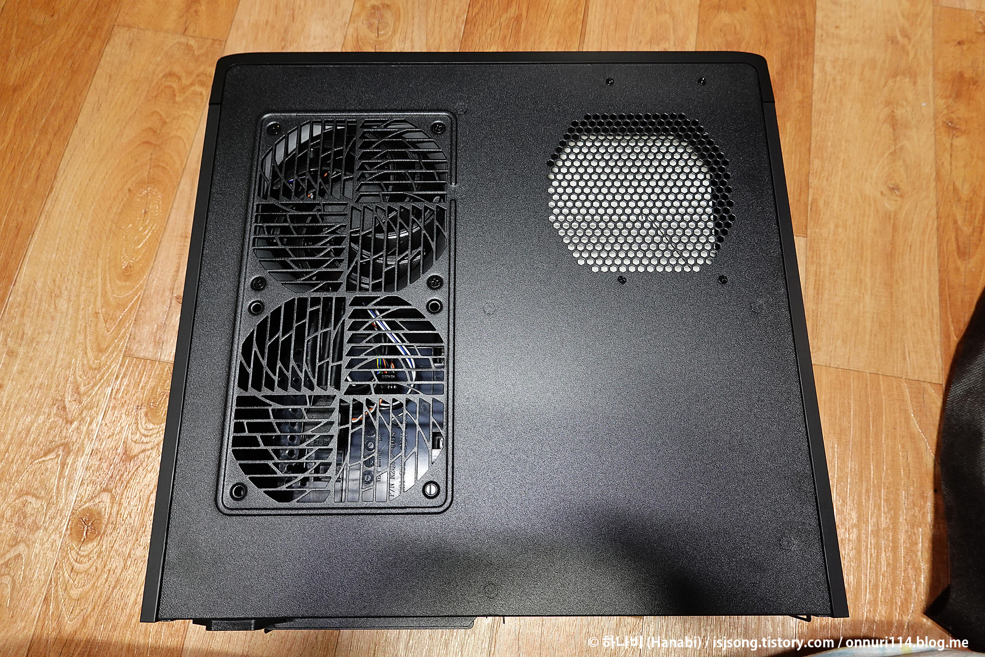 뒷면에는 그래픽카드쪽 120mm팬 2개와 파워 서플라이의 팬이 위치할 부분이 있는 그릴이 보입니다. (장착 팬은 1개임 - 케이스에 기본 2개포함)