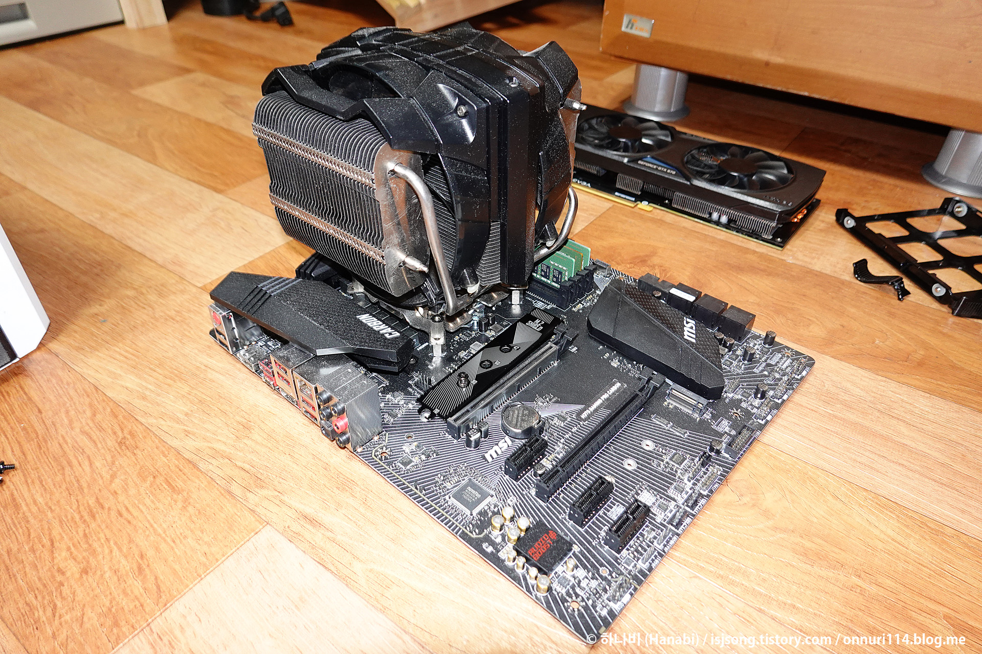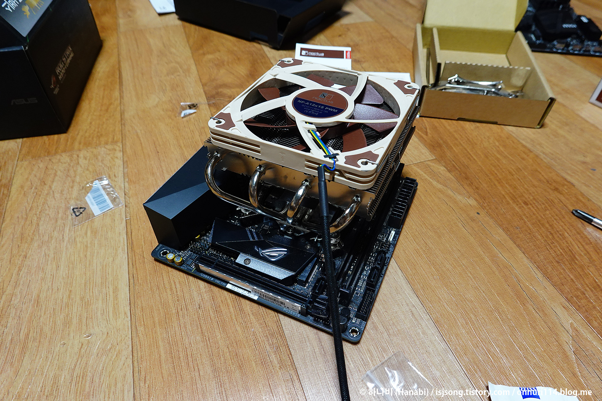 다만 보드에 저대로 장착하려니 I/O포트 가드와의 간섭이 생겨서 일반 LP처럼 위에다가 쿨러를 달아줍니다.