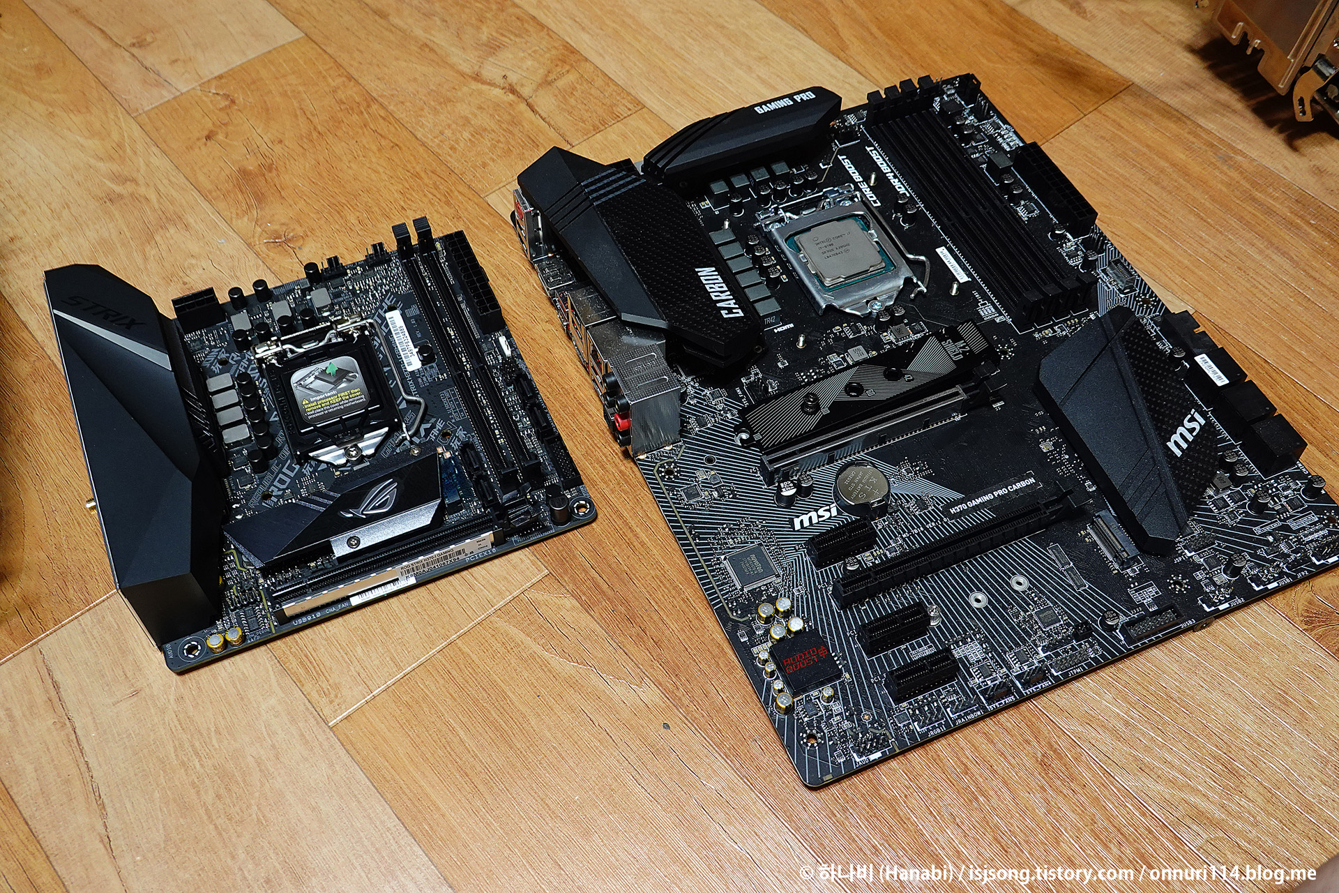 표준크기 보드인 H370보드와 m-ITX보드의 크기 비교입니다.