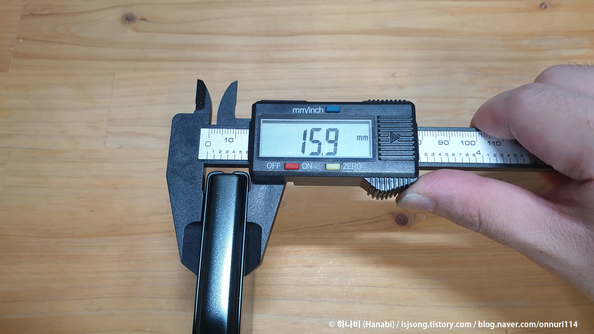 얼마나 얇아졌나 한번 힌지부를 측정해보니, 15.9mm, 대략 16mm가 나옵니다.