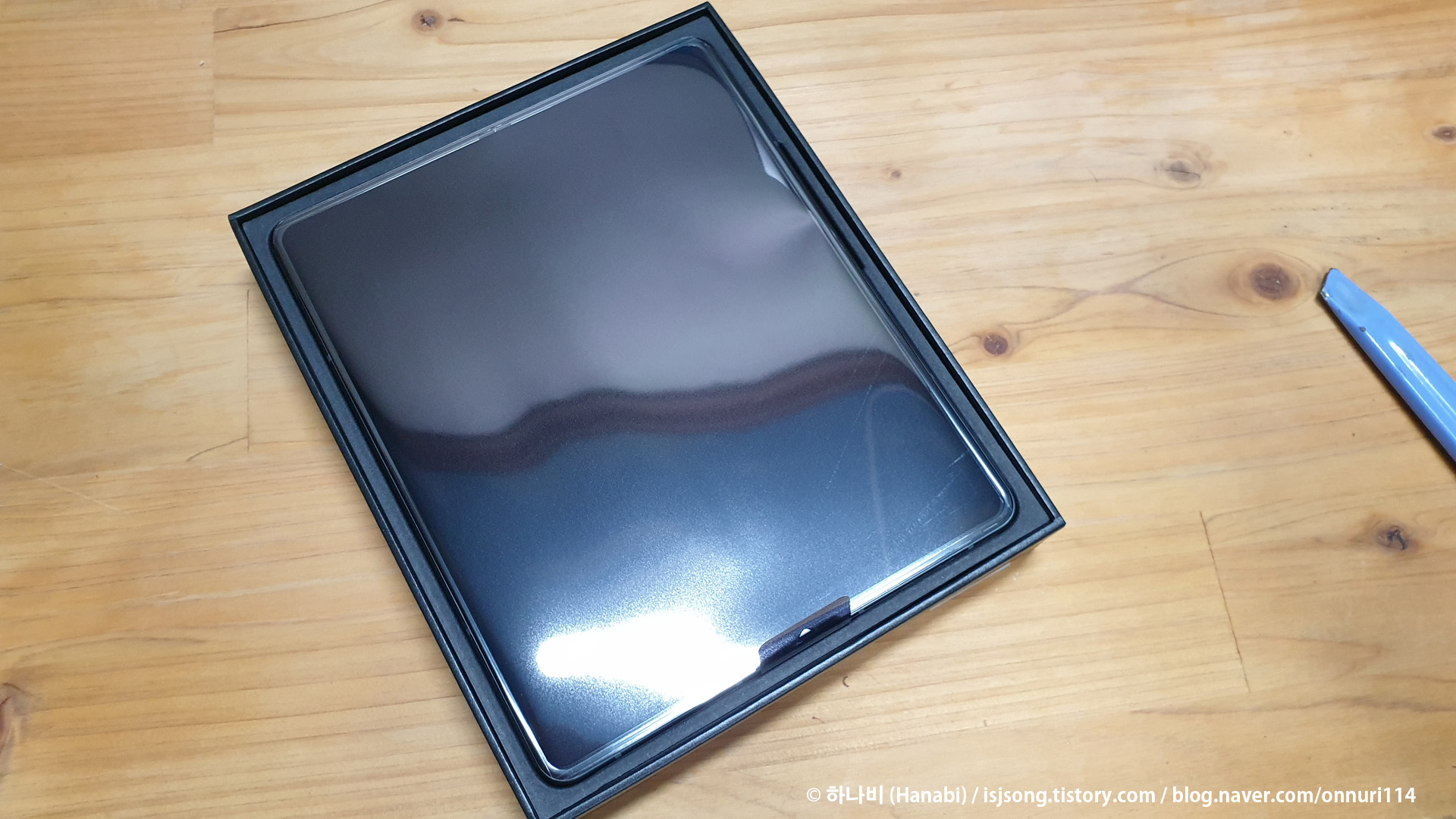 안을 개봉하면 이렇게 제품이 있는데요, 보호필름이 까만색이라서 힌지 주름이 없는것처럼 보입니다 ^^;;;