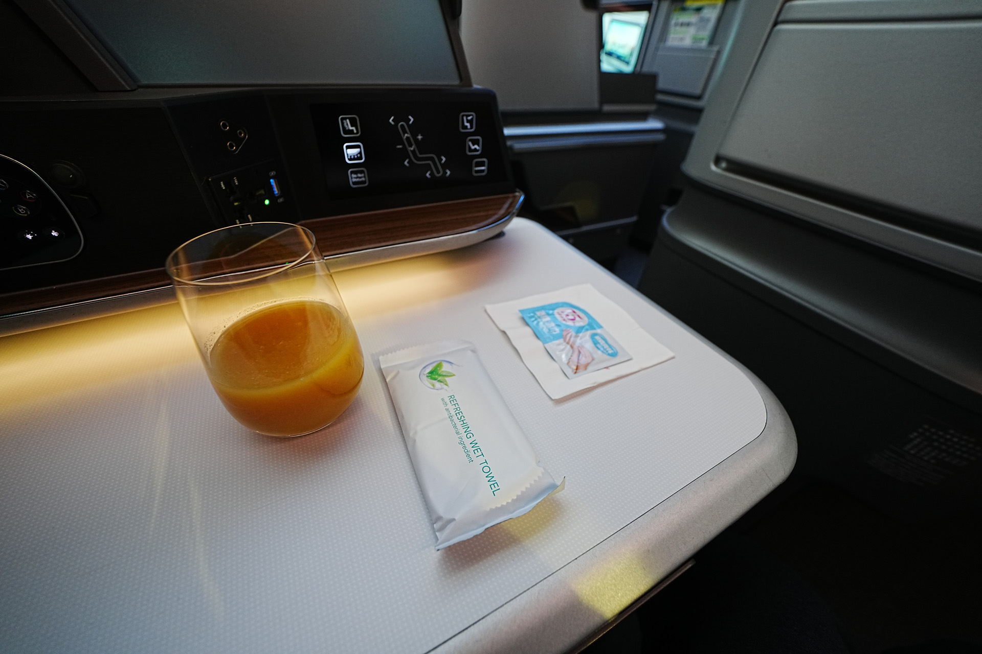출발 직전 승무원이 오더니 웰컴드링크와 알코올 소독제, 그리고 손수건을 나누어줍니다.