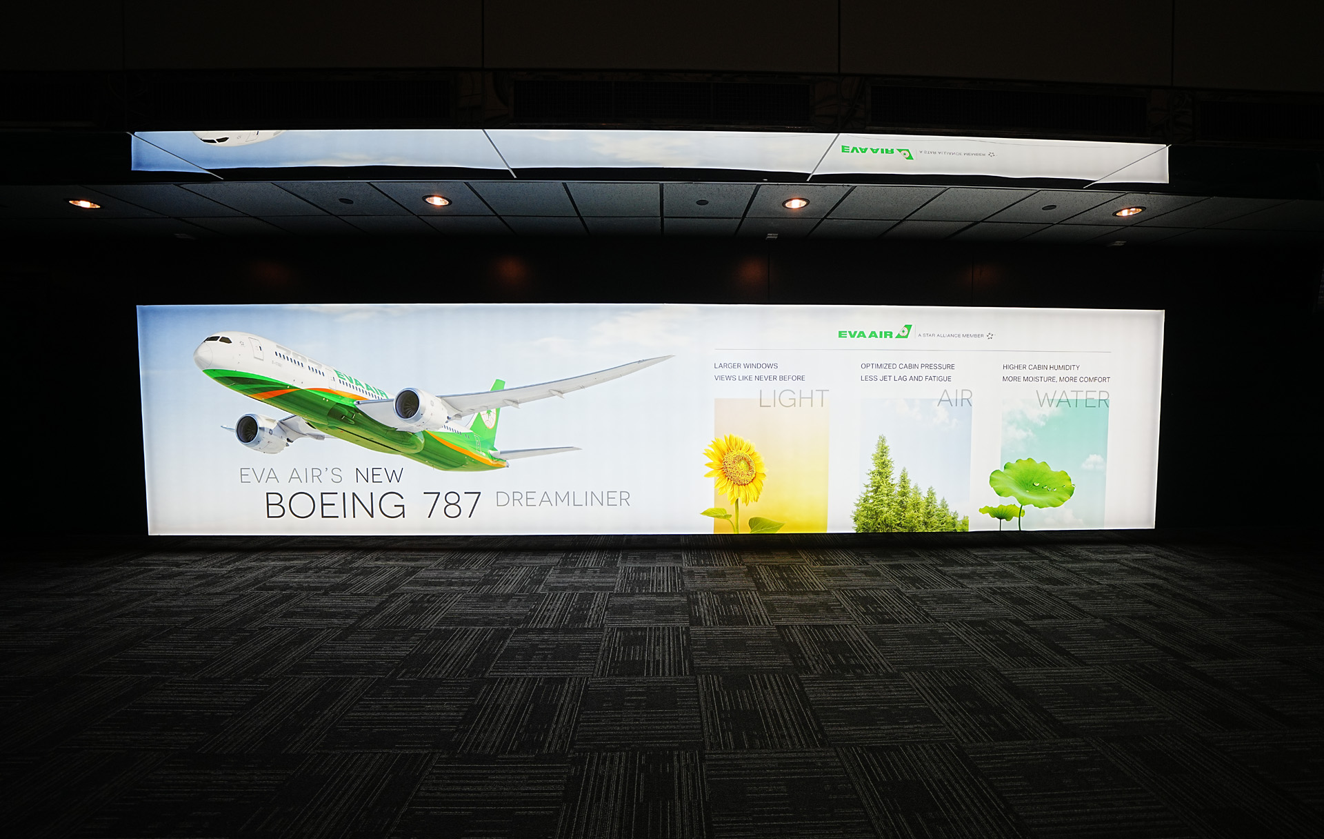 라운지 근처 벽에는 이렇게 EVA의 새 주력 항공기인 B787에 대한 홍보 간판이 대문짝만하게 걸려있습니다.