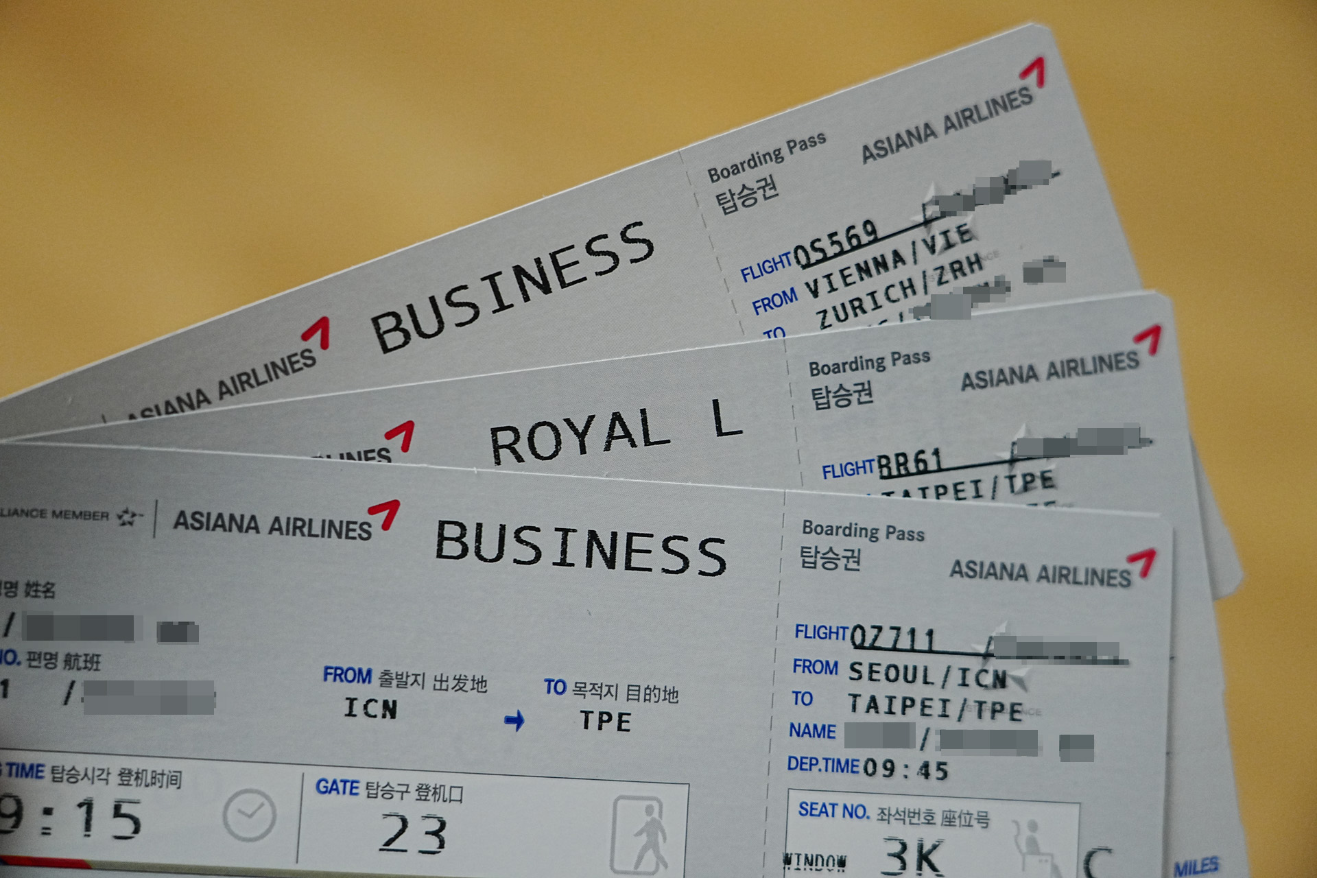 아시아나 마일로 발권하였으며, ICN-TPE-VIE-ZRH로 구불구불 돌아가는 여정이었습니다.