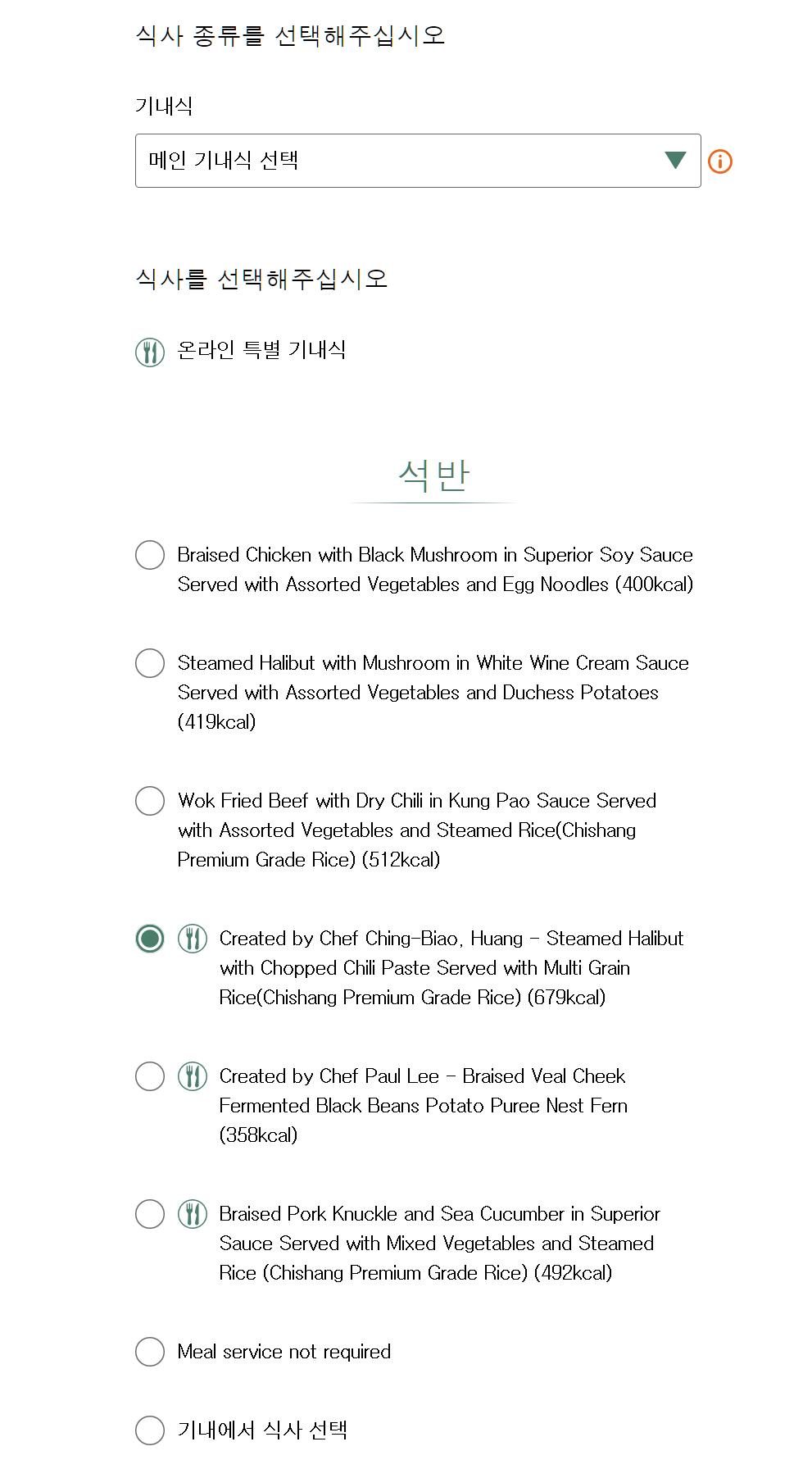 이후 메인 기내식이 서빙됩니다.