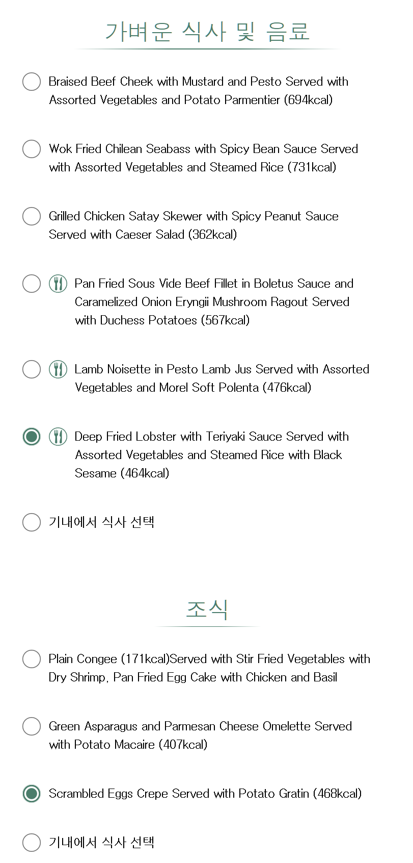참고로 EVA는 미리 인터넷에서 기내식을 지정 할 수 있으며, 싱가포르 항공처럼 이 사전 신청 기내식에서만 맛볼 수 있는 메뉴들이 있습니다.