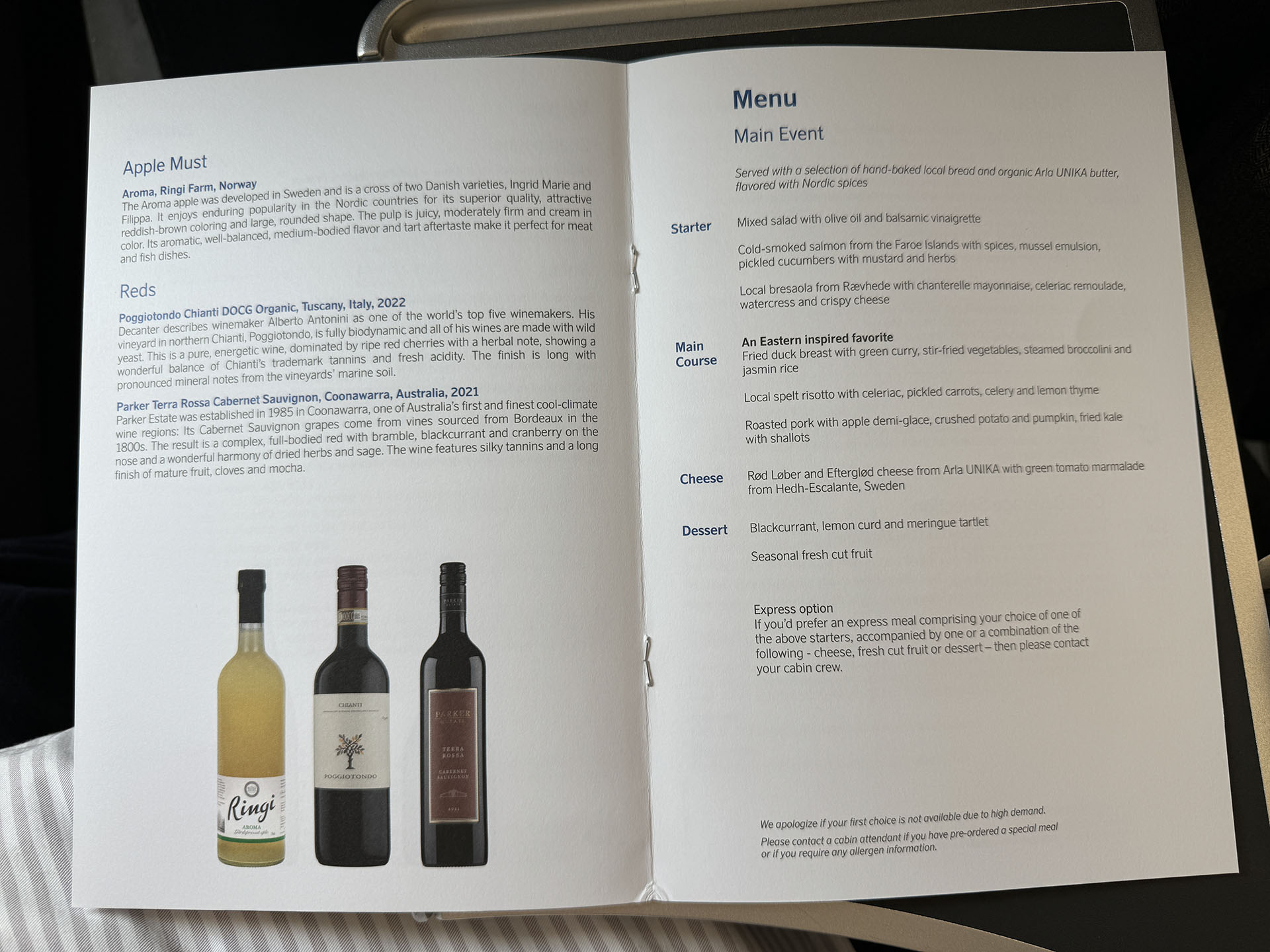 기내식 메뉴판입니다.