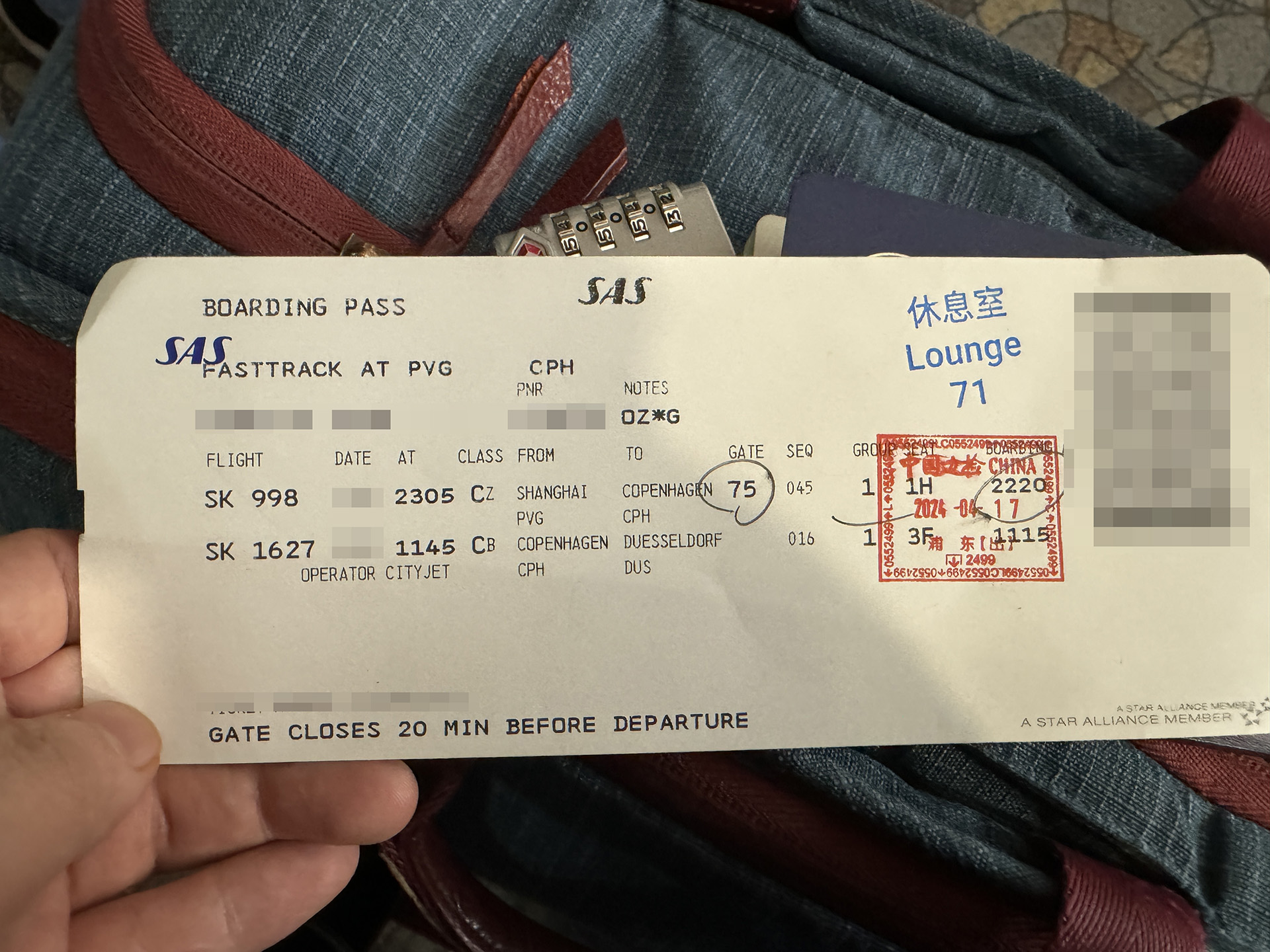 따라서 CPH-DUS간 SK1627은 따로 분리발권을 하였고, 체크인시 동시 체크인하면서 붙였습니다.