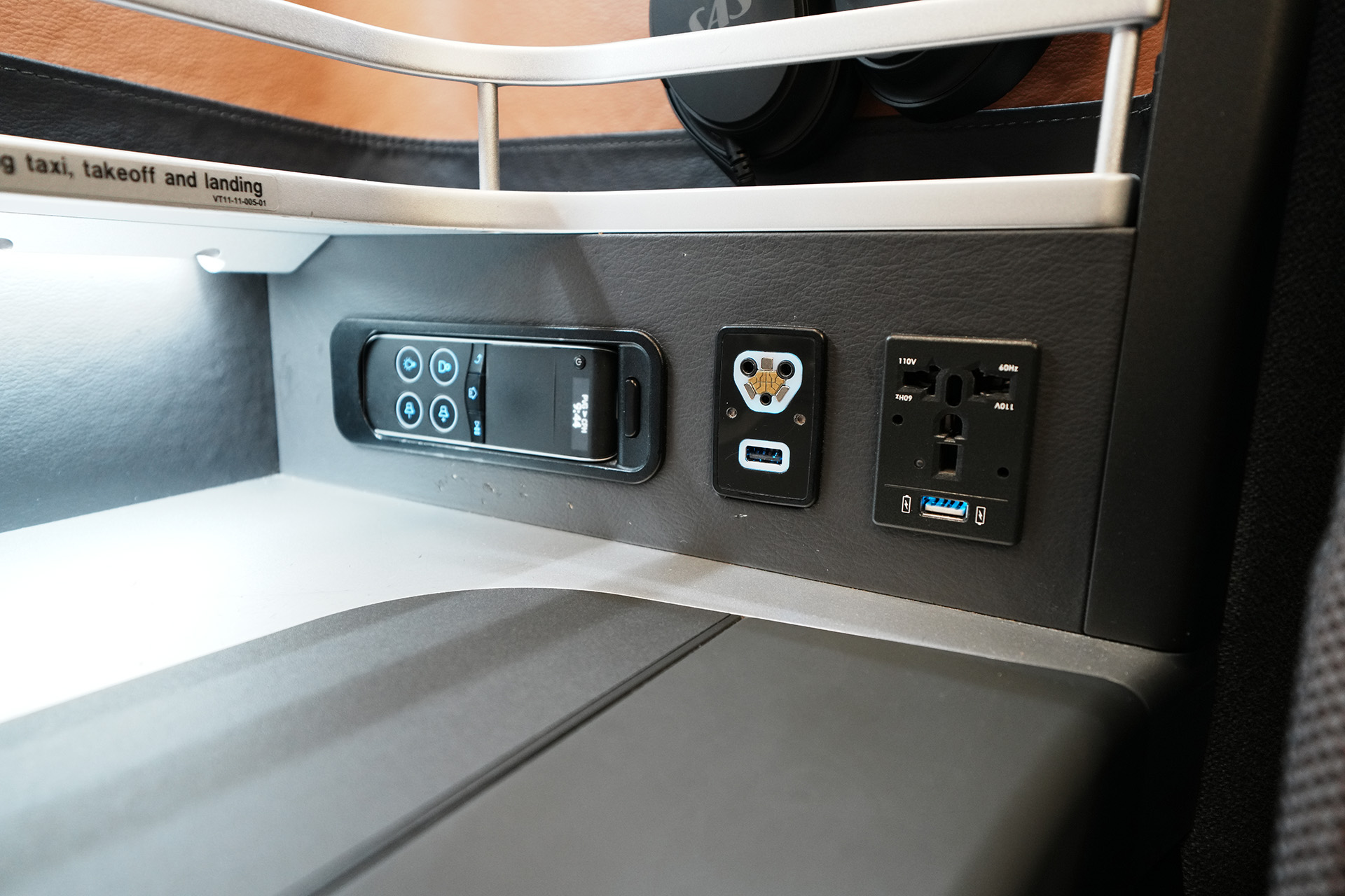컨트롤러는 대한항공 A321에서 보던 그것과 비슷한 형태고, 총 2개의 USB-A 충전 포트와 1개의 유니버셜 110V 플러그가 제공됩니다.